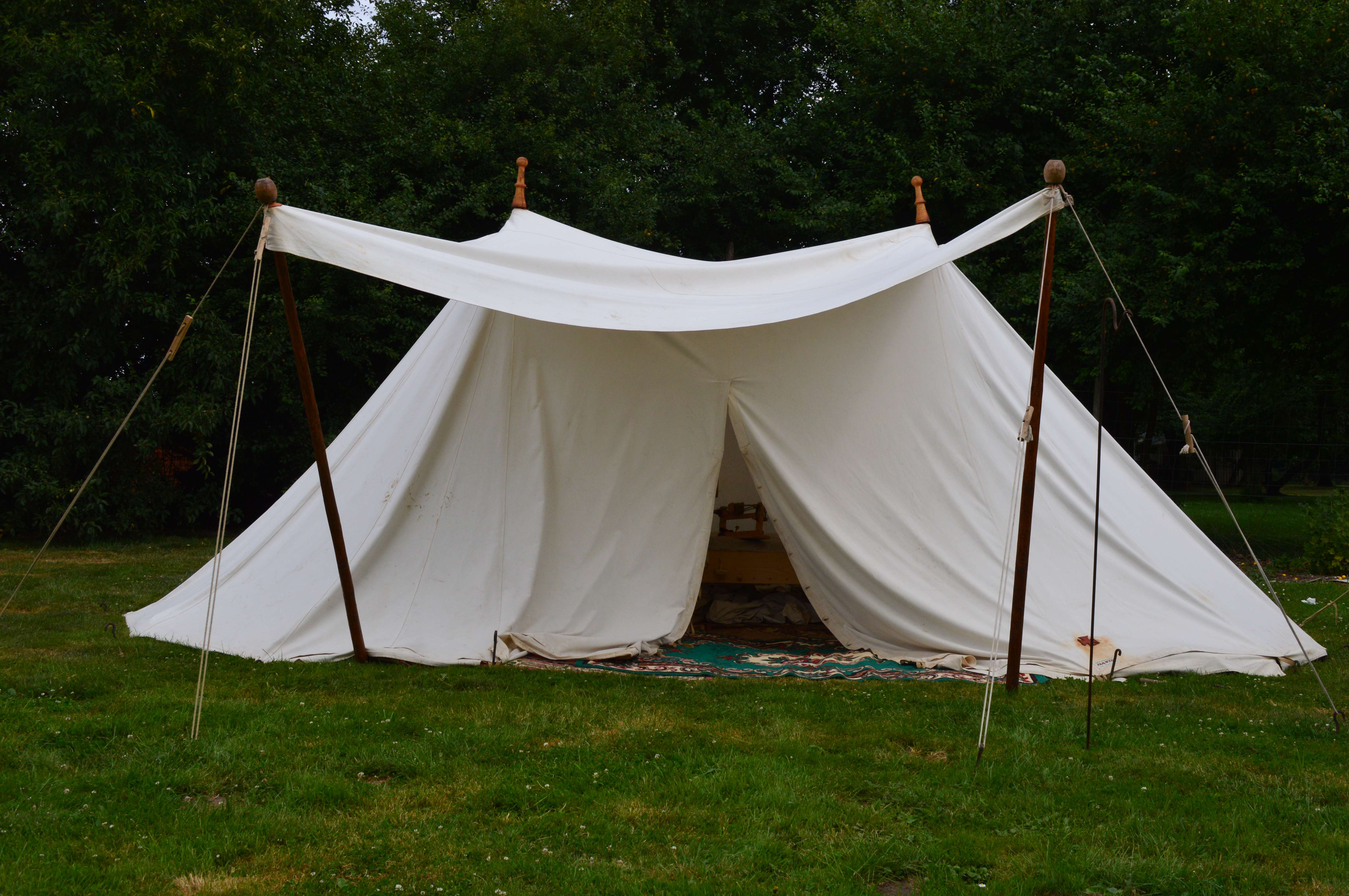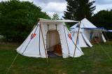 Cette tente unique a été peinte par nos soins. Elle se rapproche de nombreux modèles trouvés sur des gravures. Elle nous permet d'accueillir jusque six personnes, ou peut nous servir de tente logistique en cas de besoins...