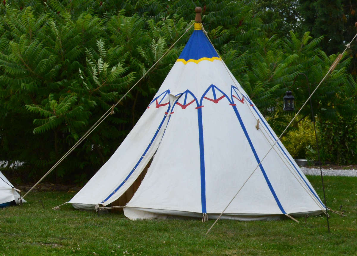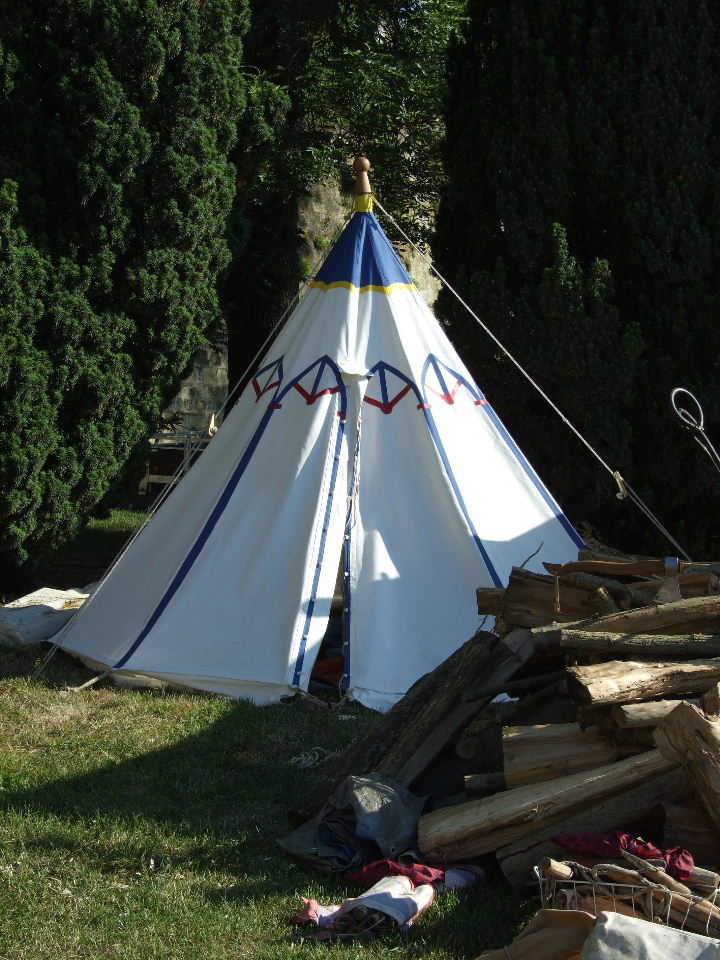 Cette tente unique a été peinte par nos soins. Elle se rapproche de nombreux modèles trouvés sur des gravures. Elle nous permet d'accueillir jusque six personnes, ou peut nous servir de tente logistique en cas de besoins...
